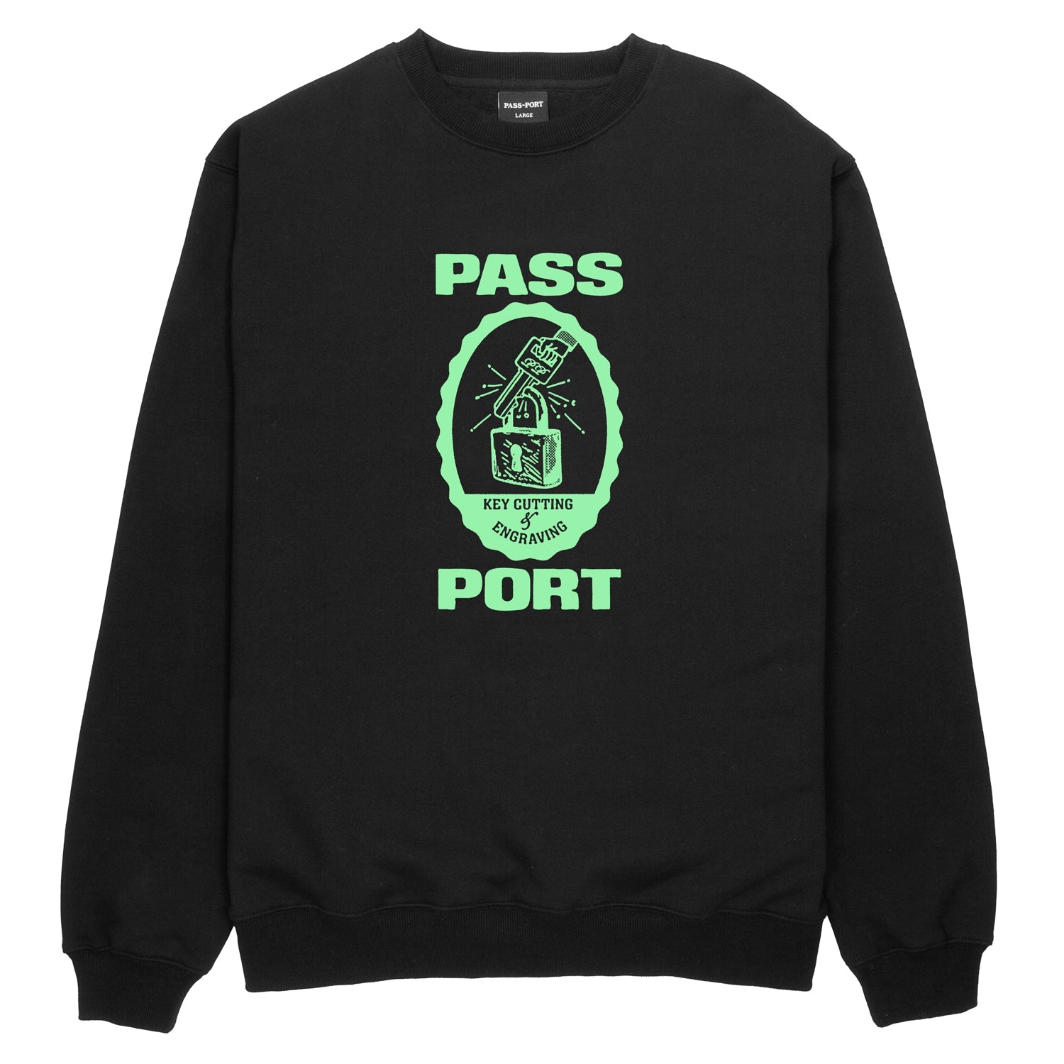 Pass~Port Hercu-Locks sweater in Black is part of the fleece collection for range #46. This crewneck is made from a cotton polyester blend and features screen print graphic on front and back, finishing in the classic Pass~Port sweater fit.