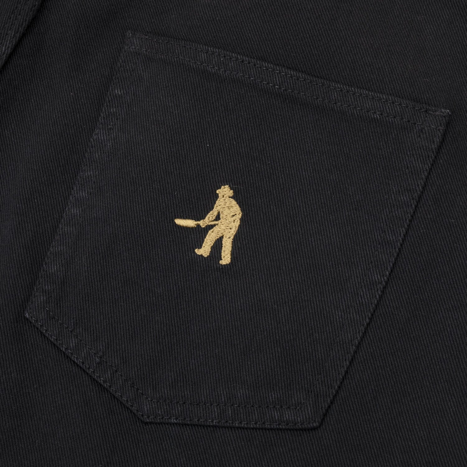 Pass~Port Quandong Workers Club denim jean in washed black from range #42. The Workers denim pant is made from 100% cotton 16oz rigid denim and fine yarn for extra strength. The denim jean features woven patch on front, digger embroidery on back pocket as well a faux leather label on waist.