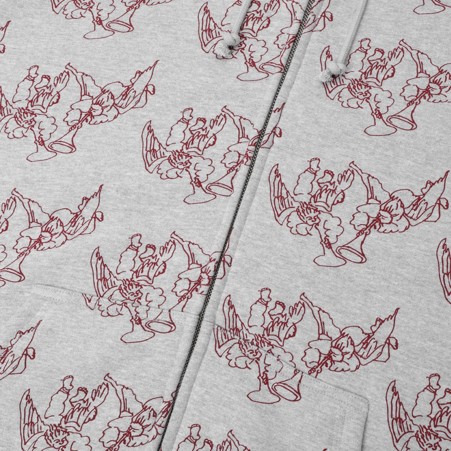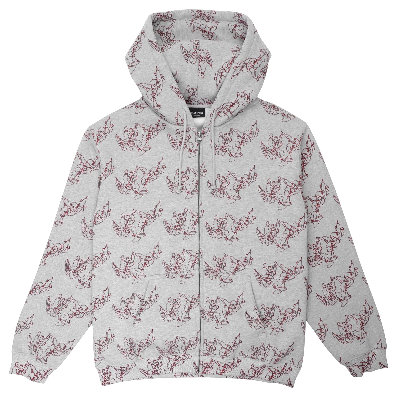 Pass~Port Trumpets Zip Hood in Ash from range #47. This hoodie is made from a cotton poly blend and features an all over print with YKK zipper, finishing in the signature Pass~Port fit.