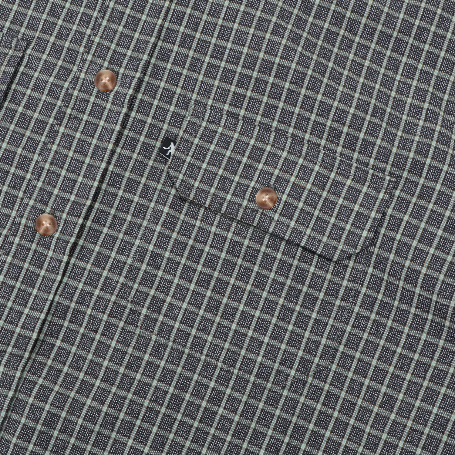 Pass~Port Workers Check Long Sleeve Shirt in Grey from range #47. The Workers long sleeve button up shirt is made from 100% lightweight cotton shirting and features double button down pockets on front with a woven label, recycled buttons & digger pip.